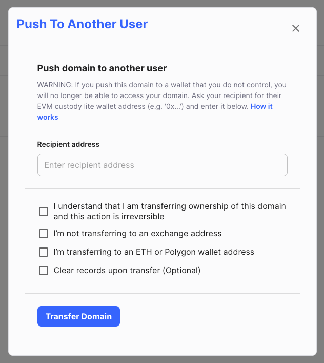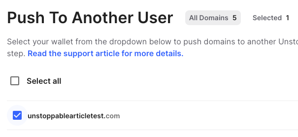 Note: If the recipient’s account is new and has not yet purchased a domain, they’ll need to contact support@unstoppabledomains.com to have a custodial wallet created.