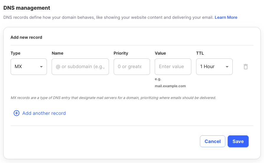 If your email provider gives you multiple MX records, you’ll need to add each one separately, making sure to set the Priority exactly as provided. This ensures email is delivered in the right order if a server is unavailable.