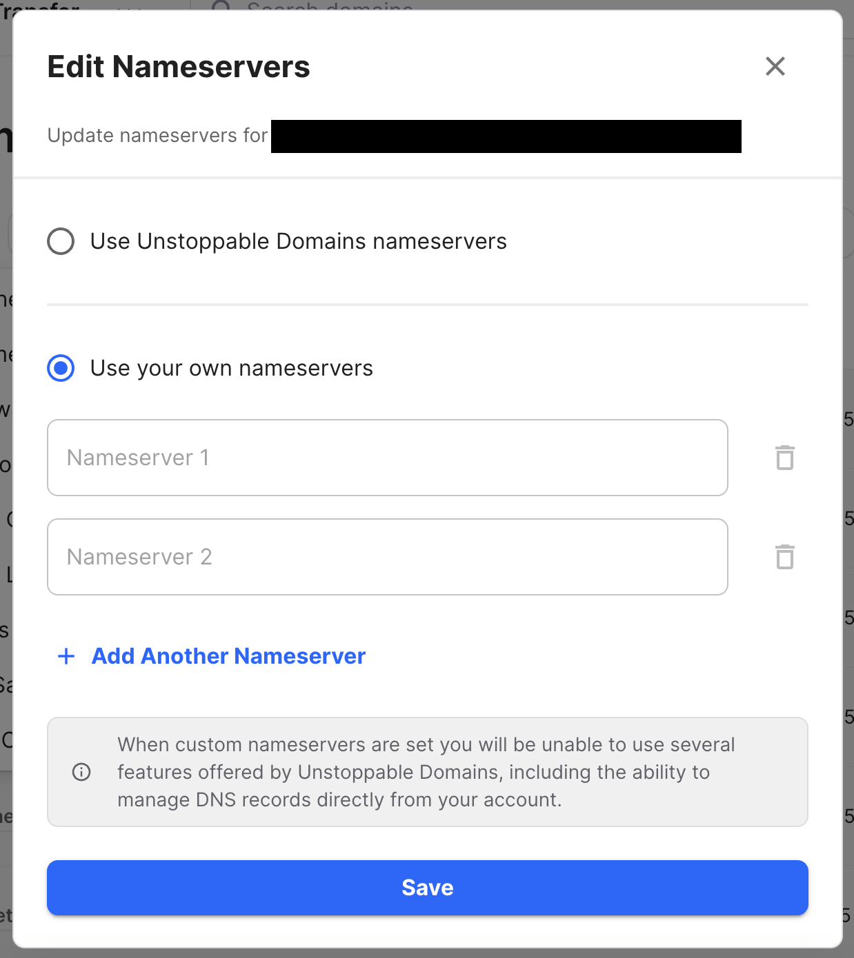 Important: When custom nameservers are set, you cannot edit DNS records in your Unstoppable account until they are switched back to the default nameservers.