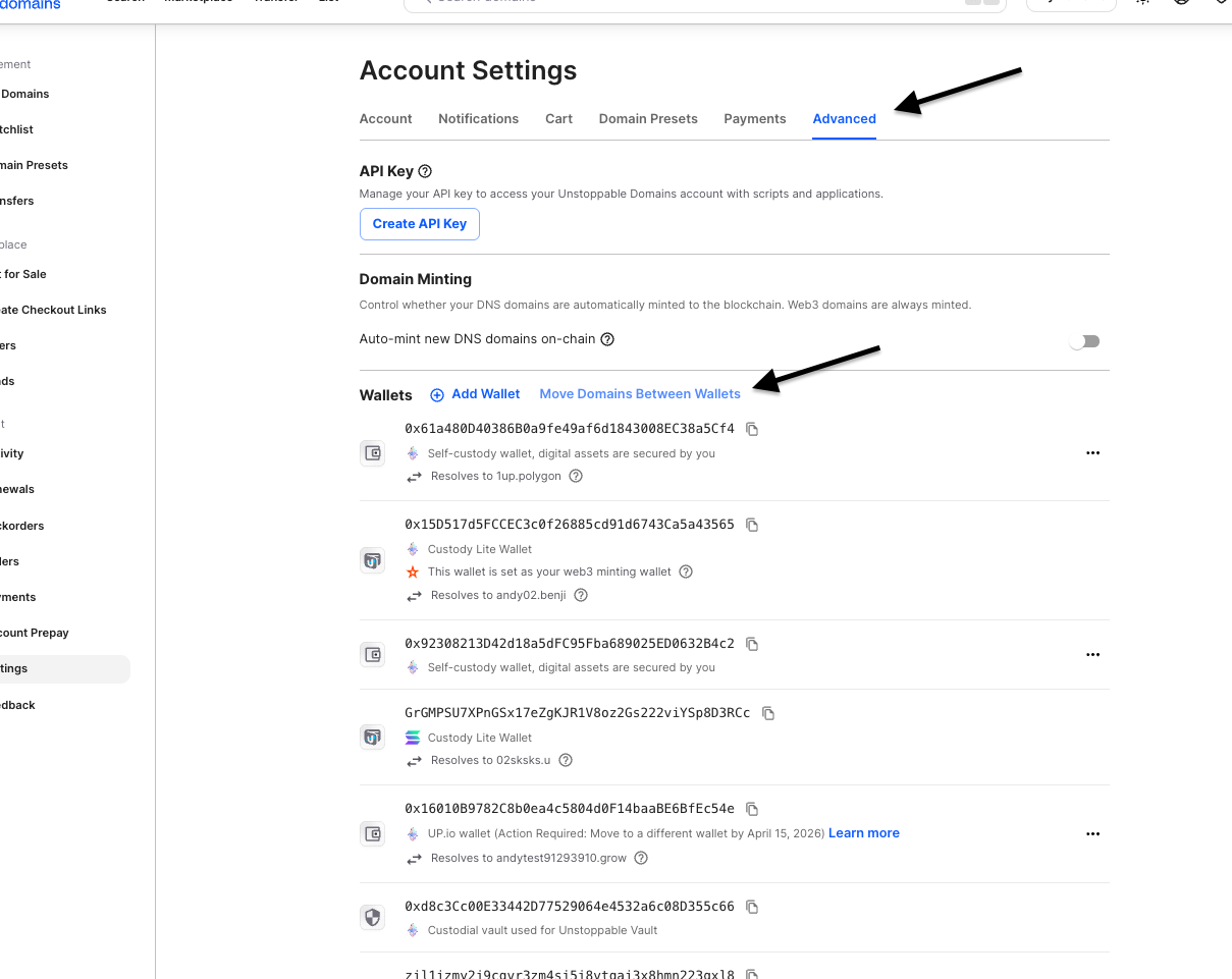If your domain is a DNS domain, you will need to transfer them one by one, by logging into the up.io app and clicking 'Collectables':