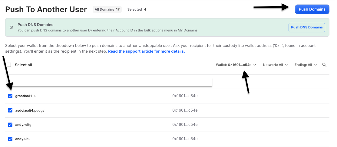 Select the address that corresponds with your lite wallet and select the domains you wish to transfer, then 'Push Domains':