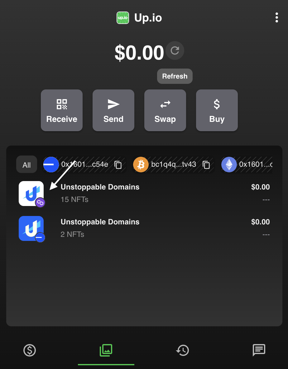 To transfer domains from the up.io wallet, you'll need to download up.io from here and log in to your account. We advise you download the browser extension.